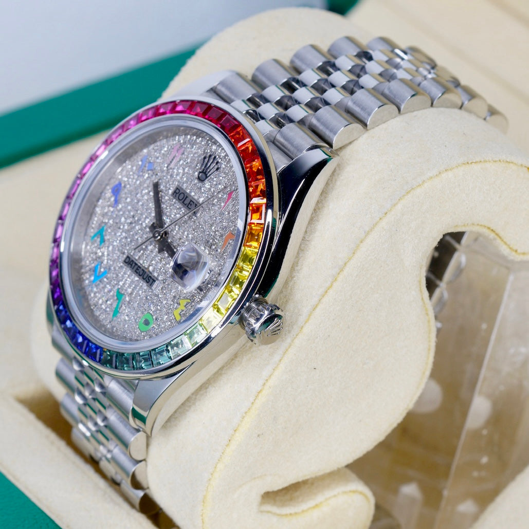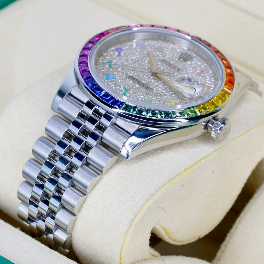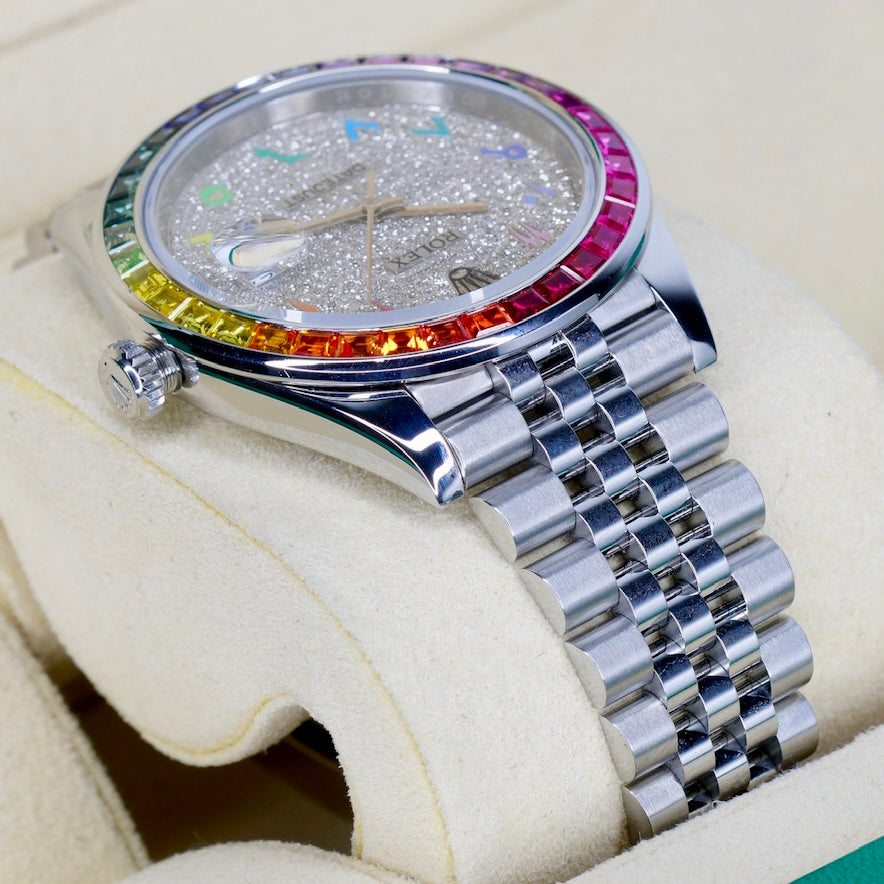 Rolex Datejust 126300 “AM ARABIC RAINBOW” Aftermarket Diamond Arabic Dial Aftermarket Rainbow Bezel Stainless Steel Jubilee 41mm